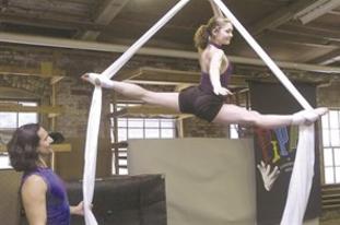 During a recent rehearsal, he was putting that actress, Sara Antkowiak-Maier, through her paces on the white silks and lyra (which looks like a Hula Hoop) hanging from the ceiling. As Gesmundo told her in calm, encouraging tones what to do, Antkowiak-Maier flipped herself around on the lyra, hanging upside down with her legs in a split. Later she suspends herself gracefully by one hand, with her arms and legs stretched out into a balletic pose. She moved on to the long white curtains of silk hanging from the ceiling, doing similar aerial moves.