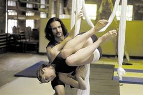 Stunt coordinator Ottavio Gesmundo puts Sara Antkowiak-Maier through her aerial paces in preparation for Goodspeed's production of "Pippin."