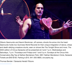 “New acts dazzle: Mr. and Mrs. G. (Ottavio Gesmundo and Naomi Brenkman-Gesmundo) could challenge Katniss on their crossbows”- Nancy Churnin